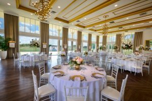 The centerpiece of the clubhouse is the Royal Palm Ballroom, an elegant space that provides a spectacular setting for events and celebrations amidst a backdrop of natural beauty. Floor-to-ceiling windows offer stunning views of the golf courses and water features. Additional features such as wooden floors, large mirrors, and botanical artwork contribute to the elegant, understated décor.