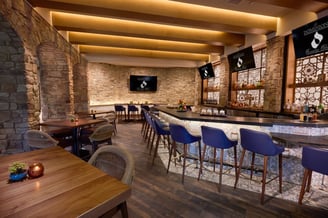 The reimagined 19th Hole bar and lounge, an exclusive adults-only retreat, offers cocktail and soft seating to encourage social gathering and conversation. The color palette remains warm and complements existing stone and hand-painted ceiling features with neutral tones accented with rich hues of blue and terracotta.